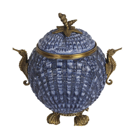 A hand painted porcelain box with intricate shell patterns and textures. The Blue Seahorse Canister makes a lovely gift and is a unique piece to have on display on a shelf or mantel to bring a little underwater life to any interior. Ornate shells on the lid and feet, and seahorse shaped handles elevate this special box. The Blue Seahorse Canister is ideal for storing small trinkets such as jewellery.