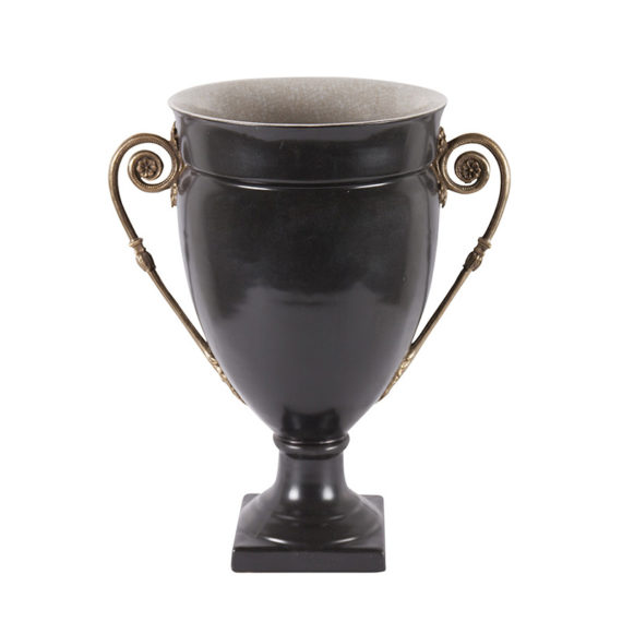 Introduce this splendid and elegant vase into the home. The Fabuge Vase, Black is made from beautiful porcelain, with a regal shape and the addition of brass handles. The spiral brass shapes add an ornate twist. Fill with a plant for a splash of greenery for anywhere in the home.