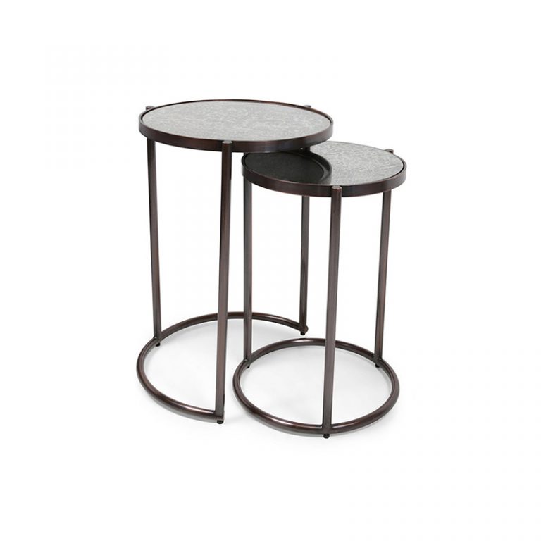 Combine or separate the Kippel Tables, Copper as you like to create unique design combinations. The tables have an antique mirror top, and are also available with a nickel or copper finished frame.