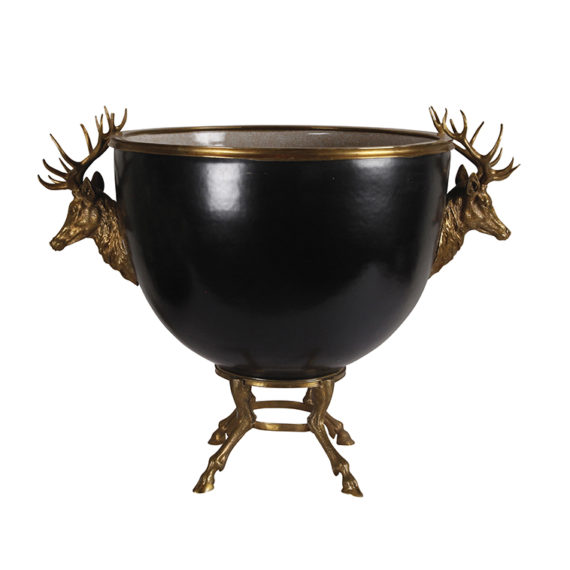 The Stagio Planter, Black is a show-stopping planter with unique design elements. Black porcelain and regal brass trim is kept playful with two stag heads on the sides, and stag feet supporting the planter. The vastness of this piece means it would work beautifully to display a large plant, or be creative and use it to keep bottles of champagne cool on ice.